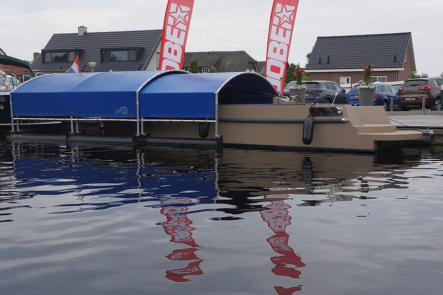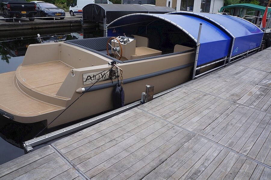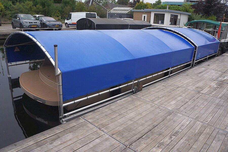 Volledig drijvend boothuis van Genius uit 2018, Het botenhuis is afgeleid van de standaard uitvoering, verhoogt met 25cm, verbreed met 50cm en voorzien van een eindkleed. Het boothuis is voorzien van RVS geleide assen voor de montage aan de vaste wal of steiger en bestaat uit een vast gedeelte van 6 mtr en een schuifbaar gedeelte van 4 mtr. Door het openschuiven van het boothuis is het gemakkelijk laden en instappen en doordat de kunststofdrijver aan de waterkant mee schuift is het gemakkelijk in- en uitvaren. De binnenmaten van het boothuis zijn 980 cm lang, 320 cm breed en in het midden 166 cm hoog (hoogte boven de drijvers 115 cm). De HPDE drijvers zijn deels gevuld met water wat het boothuis stormvast maakt.
